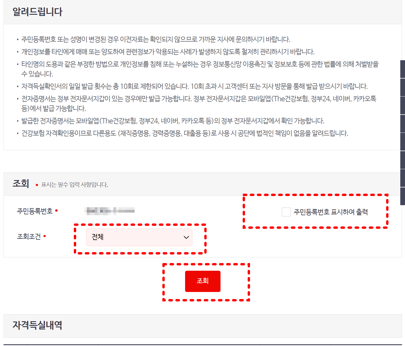 2. 주민등록번호 뒷자리가 필요하신 분은 체크박스에 체크하고, 조회조건을 선택한 다음 조회버튼을 눌러줍니다.