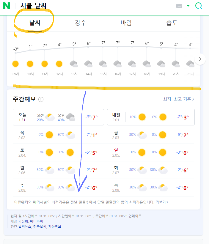 이번주와 다음주 서울 날씨를 보더라도 기온이 올라갈 기미를 보이지 않네요.. 계속 영하권입니다.