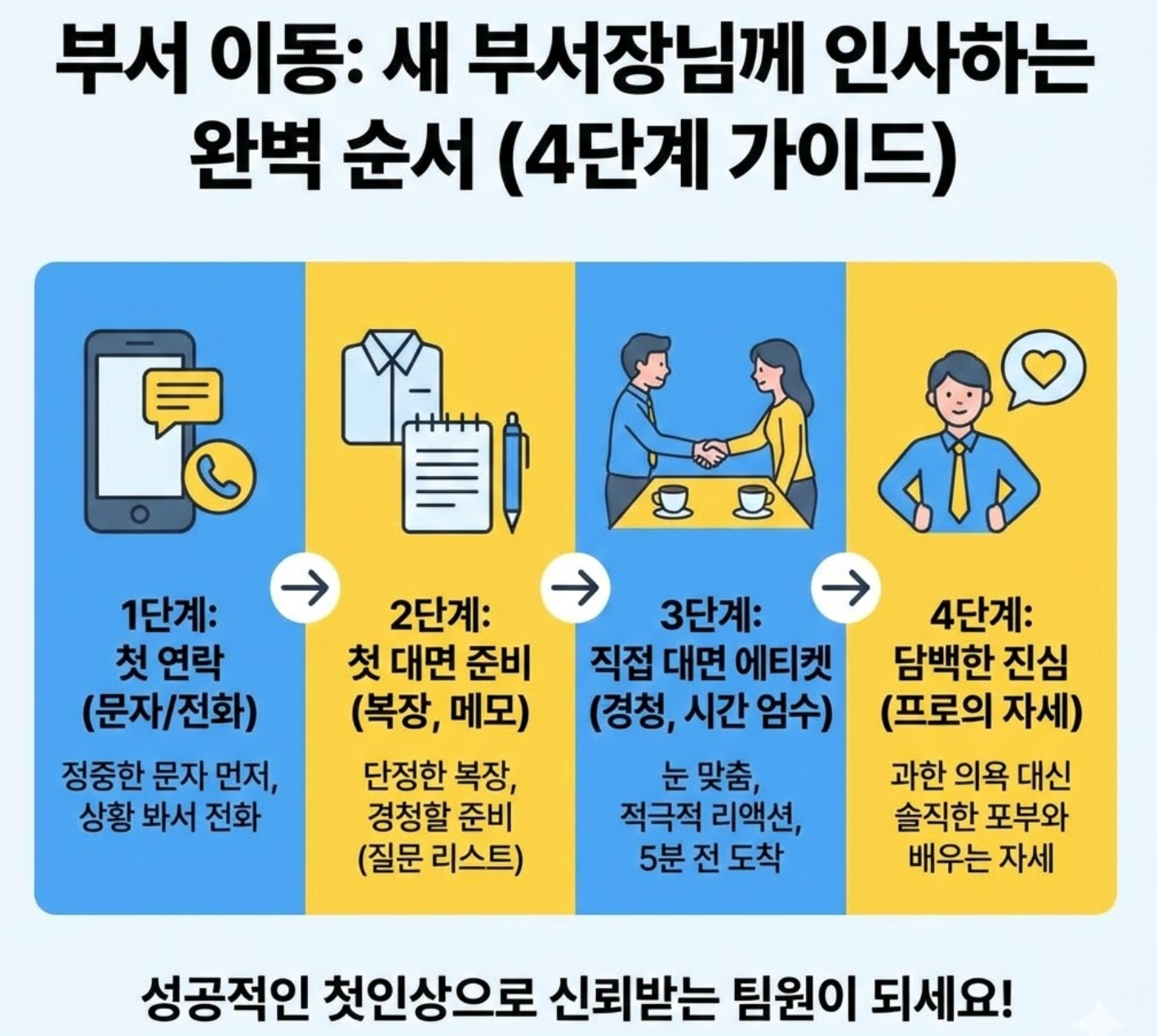 - 메모장과 펜 지참: 부서장님이 하시는 말씀(부서의 목표, 강조하는 가치관 등)을 경청하며 메모하는 모습은 "나는 배울 준비가 되어 있다"는 가장 강력한 신호입니다.